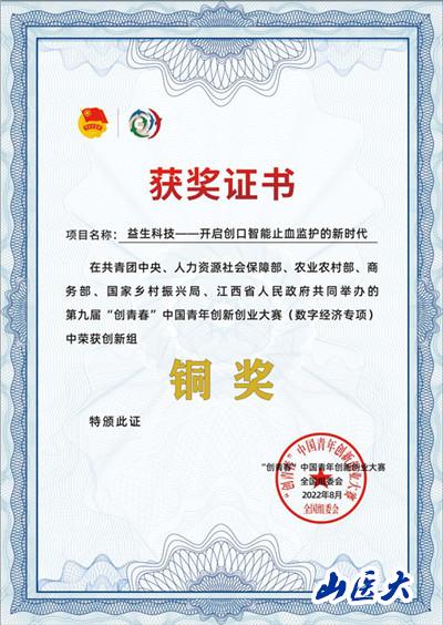第九届“创青春”中国青年创新创业大赛开展以来,学校高度重视、精心组织、认真部署,广泛动员全校师生积极参与。经大赛全国组委会评审、审核确认后,我校2项作品从全国众多高质量参赛作品中脱颖而出。其中,数字经济专项赛道的《益生科技——开启创口智能止血监护的新时代》获得创新组铜奖,科技创新专项赛道的《优瑞健康——膀胱癌早筛的领航者》获得创新组优秀奖。