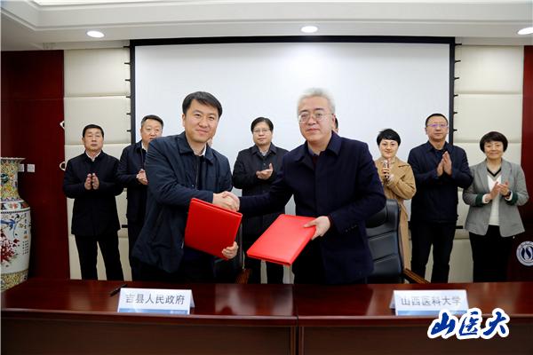 赵文军代表学校与吉县政府签署了合作协议;陈锋为吉县设在我校的“双招双引”工作站进行了授牌。