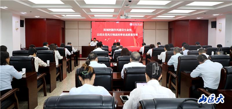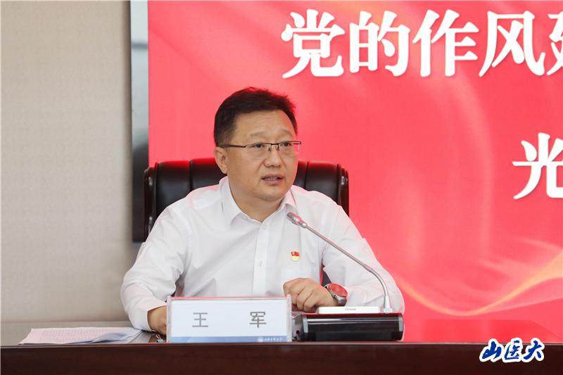王军指出,在这次系统深入的学习教育中,我们重温规定原文,追溯历史脉络,对照现实问题,对加强党的作风建设的极端重要性有了更为清醒、更为深刻的认识。他认为,这是关乎党心民心、决定生死存亡的生命线,是砥砺初心使命、淬炼党性修养的磨刀石,是引领时代新风、重塑政治生态的宣言书,是蕴含战略远见、彰显制度伟力的基础工程。他指出,回望百年奋斗路,党的作风建设始终与党的事业发展紧密相连、相互促进。新民主主义革命时期培育优良传统作风,社会主义革命和建设时期继承和弘扬优良传统作风,改革开放和社会主义现代化建设新时期加强和改进党的作风,中国特色社会主义新时代推动党的作风根本好转。党的十八大以来,党的群众路线教育实践活动、“三严三实”专题教育、“两学一做”学习教育、“不忘初心、牢记使命”主题教育、党史学习教育等一系列党内集中教育接续开展,都贯穿着加强党的作风建设的鲜明要求。他强调,要以永远在路上的坚韧执着,将作风建设成果转化为推动学校事业高质量发展的磅礴力量。要以优良的作风推动学校事业“向远闯关”“向上突围”“向新图强”“向效提质”,不断推进高质量发展。要聚焦重点精准发力,推动作风建设走深走实。坚持把政治建设摆在首位,深入学习领会习近平总书记关于作风建设的重要论述和指示批示精神,引导党员干部和广大师生医护员工不断提高政治判断力、政治领悟力、政治执行力。坚持发挥“头雁效应”,带头严格执行中央八项规定及其实施细则精神,带头改进调查研究,带头精简会议活动,带头厉行勤俭节约,带头密切联系师生医护员工,带头主动担当作为。坚持纠治“四风”,坚决整治文山会海、检查考核过多过滥、工作落实“中梗阻”等问题。坚持厚植为民情怀,牢固树立以师生为中心的发展思想,倾听师生心声,解决师生在学业、就业、生活、发展等方面遇到的困难和问题,把作风建设成效体现到服务师生、凝聚人心的具体实践中。坚持扎紧制度笼子,以钉钉子精神统筹推进学校育人方式、办学模式、管理体制、保障机制改革,实现党的作风建设和学校高质量发展有机统一。