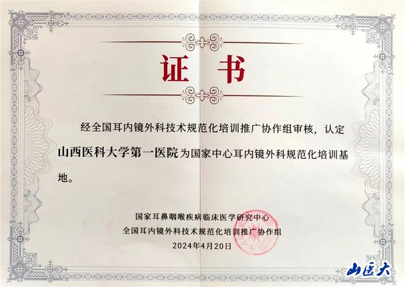 4月20日,第一医院耳鼻咽喉-头颈外科主任皇甫辉带领耳外科组成员赴武汉市对申报的“2024年国家中心耳内镜外科规范化培训基地”进行了现场汇报,经全国耳内镜外科技术规范化培训推广协作组对科室软硬件建设、学科影响力及人员资质的审核、认定后,取得了山西省首家“国家中心耳内镜外科规范化培训基地”资格。