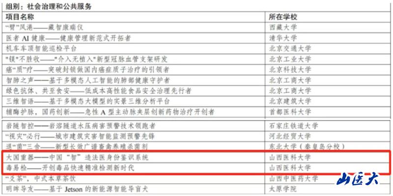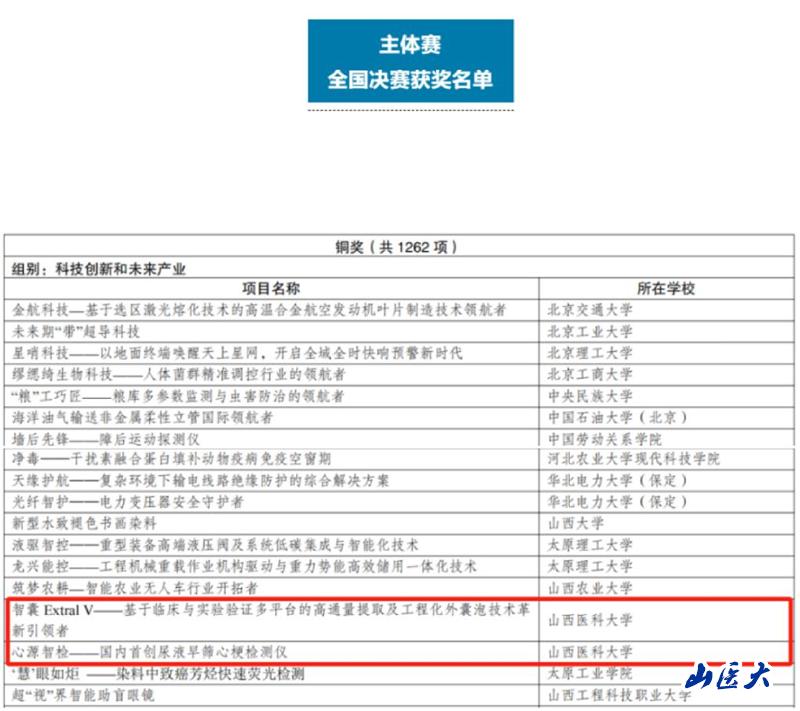 我校第二临床医学院《智囊Extral V——基于临床与实验验证多平台的高通量提取及工程化外囊泡技术革新引领者》团队和管理学院《心源智检——国内首创尿液早筛心梗检测仪》团队喜获科技创新和未来产业组别铜奖,法医学院《大国重器-中国“智”造法医身份鉴识系统》团队和《毒易检——开创毒品快速精准检测新时代》团队喜获社会治理和公共服务组别铜奖。