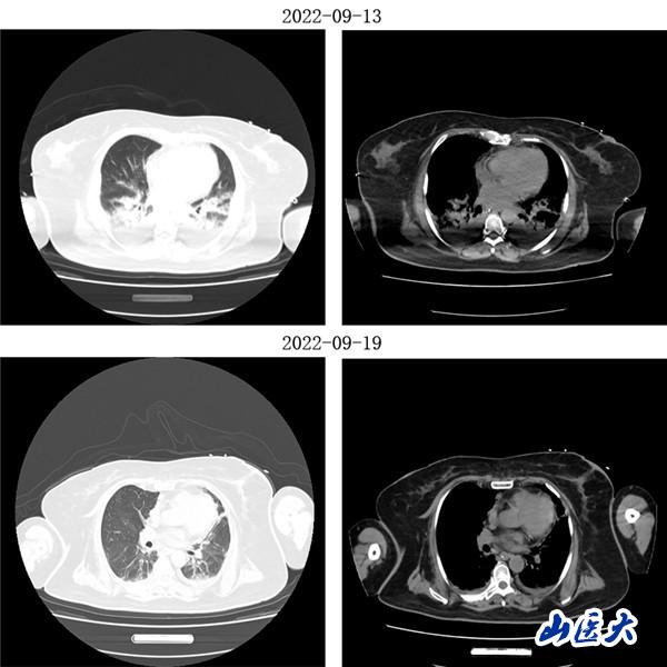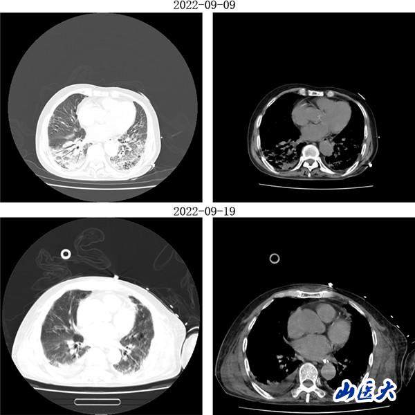 重症医学科三病区张文凯主任团队深入分析了两位患者的病情。考虑到两名老年患者均已出现急性呼吸窘迫综合征,决定采用俯卧位通气技术为他们治疗。在张文凯主任的指导下,侯林义主治医师带领张承、孙洁住院医师对女性患者经俯卧位通气治疗,92小时后复查胸部CT,双肺明显好转,氧合指数由90上升至300mmHg以上,吸氧浓度由100%降至35%,ARDS明显改善;对男性患者,采用联合持续性血液滤过(CRRT)治疗方案,经俯卧位通气治疗66小时后复查胸部CT,显示明显改善,同时氧合指数由102上升至360mmHg左右,吸氧浓度需求下降至40%,全身水肿情况也明显减退。