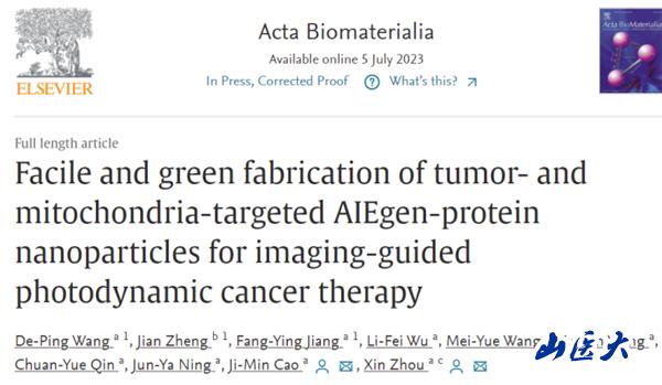 近期,细胞生理学教育部重点实验室曹济民教授和周鑫教授团队在高水平国际学术期刊《Acta Biomaterialia》(中科院一区top期刊,影响因子10.633)发表了最新研究成果:《Facile and green fabrication of tumor- and mitochondria-targeted AIEgen-protein nanoparticles for imaging-guided photodynamic cancer therapy》。青年教师王德平、博士生郑健及硕士生蒋芳颖为本文共同第一作者,曹济民教授和周鑫教授为共同通讯作者。
