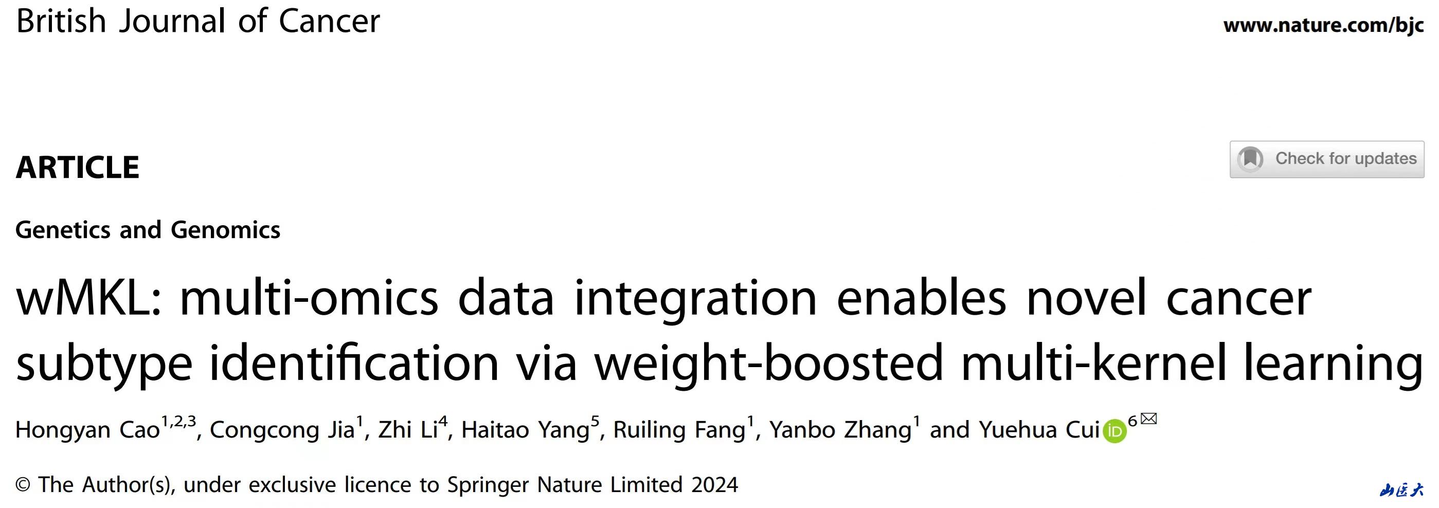 近日,我校公共卫生学院曹红艳副教授团队依托煤炭环境致病与防治教育部重点实验室、重大疾病风险评估山西省重点实验室,在中国科学院1区TOP期刊British Journal of Cancer(IF 8.8)上发表论文“wMKL: multi-omics data integration enables novel cancer subtype identification via weight-boosted multi-kernel learning”,曹红艳副教授为第一作者,密歇根州立大学统计概率系崔跃华教授为通讯作者。