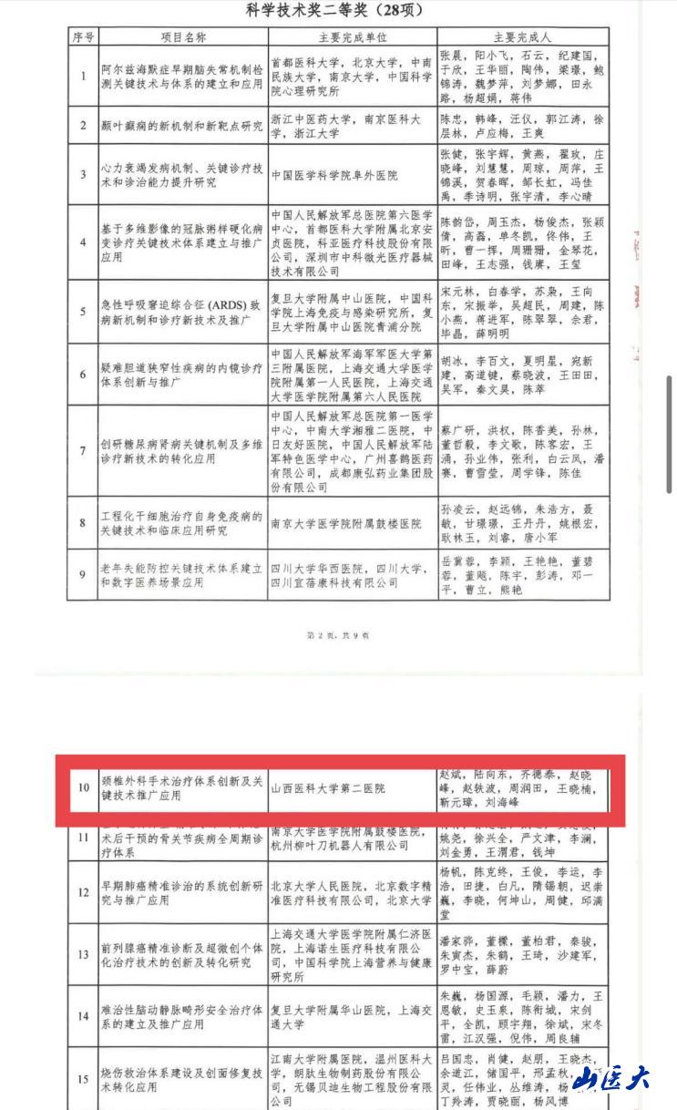 本次奖项是山西省近五年来首次以省内单位作为独立完成单位获得该奖,获奖内容主要为赵斌团队对于颈椎病治疗体系的优化创新,包括国内外首创并转化应用七种新型的颈椎前后路植入物系统以及两种创新手术方式。其中创新内植物可广泛应用于不同类型的颈椎病及颈脊髓损伤患者的治疗。两种颈椎术式包括上延至 C1-2颈椎后路单开门椎管扩大成形术和颈椎后路穹顶式全椎板可控后移椎管扩大成形术。该两种术式为国内外首创,有效解决了“上颈椎后纵韧带骨化”和“术后轴性症状”这两大颈椎外科难题,具有极大的临床推广意义。两大创新为脊柱外科医师在手术治疗颈椎病及颈脊髓损伤时,提供了新的手术器械及手术方式的选择。