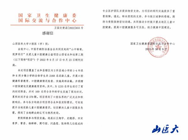 10月13日,我校口腔医院收到一封来自国家卫生健康委国际交流与合作中心的感谢信。信中,国家卫生健康委国际交流与合作中心对口腔医院在2022年“9·20全国爱牙日”期间,积极参与“山中雏菊 筑梦同行”关爱儿童口腔健康公益行动的热忱和精神给予了高度肯定,并对医院派出的技术专业团队及提供的物资支持表示了诚挚感谢。