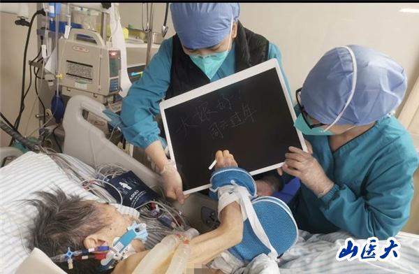 在新冠疫情的阴霾还未散去之时,我们迎来了2023年的春节。我校第二医院急诊科救治的这位老奶奶身患重症肺炎、糖尿病,送到急诊科抢救室时,心率150~160次/分,血氧饱和度80%左右,痰粘稠量多,不容易咳出,意识嗜睡到浅昏迷,收住急诊ICU。医护人员对其予以气管插管,采取呼吸机辅助通气、抗感染治疗等一系列抢救措施。第三天,患者的意识恢复,在镇痛、浅镇静下与护士用笔进行交流,特意写下了“谢谢你们”。当班护士说:“患者用心写下的这四个字就是给我们医护人员最好的春节礼物。”