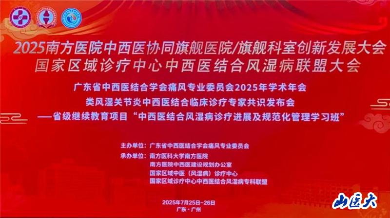 7月25日至26日,国家区域诊疗中心中西医结合风湿病联盟大会2025年学术年会暨类风湿关节炎中西医结合临床诊疗专家共识发布会在广州举行。会上,我校第一医院风湿免疫科凭借卓越实力脱颖而出,成为山西省唯一入选国家区域诊疗中心中西医结合风湿病专科联盟副主席单位的医疗科室。