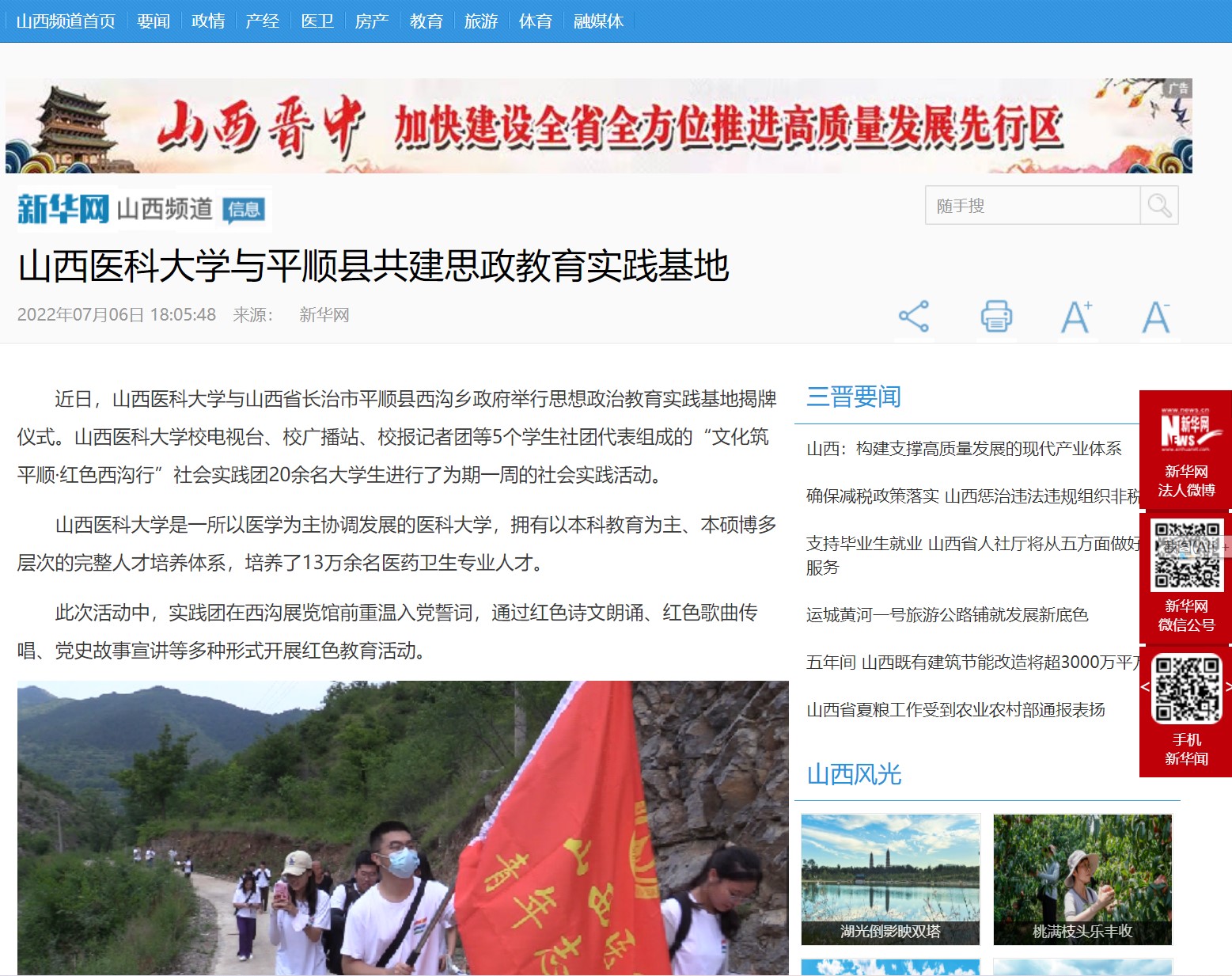 期间,实践团走进村级基层党组织,调研农村党员管理、红色网格、村级集体经济等基层党建工作;走进特色中药材产业园,了解平顺西沟千亩中药材潞党参种植基地、万亩连翘基地建设进展,针对中药材产业、“中药材+旅游”融合发展提出建议;走村入户遍访当地群众,科普科学防疫、慢性病、中医、急救、儿科用药等医学知识,为村民提供医学常识,并开展义诊活动等。