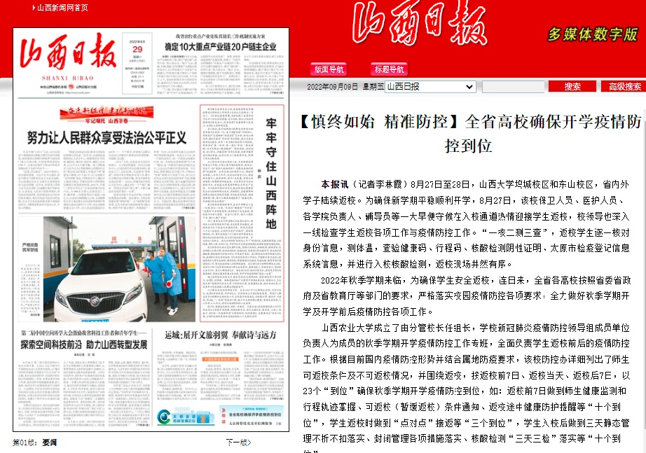 山西农业大学成立了由分管校长任组长,学校新冠肺炎疫情防控领导组成员单位负责人为成员的秋季学期开学疫情防控工作专班,全面负责学生返校前后的疫情防控工作。根据目前国内疫情防控形势并结合属地防疫要求,该校防控办详细列出了师生可返校条件及不可返校情况,并围绕返校,按返校前7日、返校当天、返校后7日,以23个“到位”确保秋季学期开学疫情防控到位,如:返校前7日做到师生健康监测和行程轨迹掌握、可返校(暂缓返校)条件通知、返校途中健康防护提醒等“十个到位”,学生返校时做到“点对点”接返等“三个到位”,学生入校后做到三天静态管理不折不扣落实、封闭管理各项措施落实、核酸检测“三天三检”落实等“十个到位”。