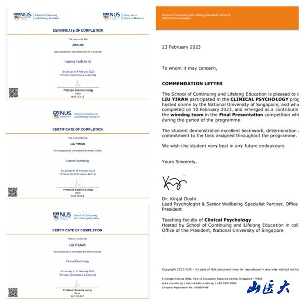 2023年寒假,我校要嘉欣、宁润宇、党海莹、黄科缙、刘怡然、刘易阳、尹玲和任洁8名同学获学校奖学金支持,与来自国内外多所院校的学子共同完成新加坡国立大学为期六周的线上访学项目学习,并取得优异成绩。