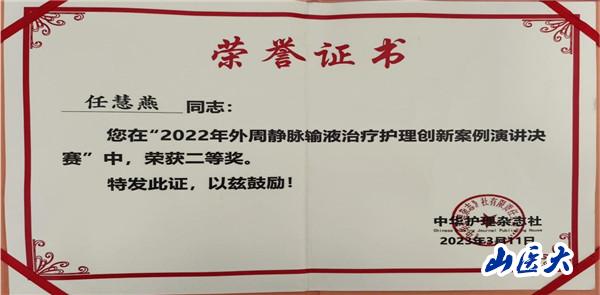 为了提升护理专科高质量发展、推进产学研相结合的护理技术创新研究,探索护理管理新模式、新方法、新理念,推广护理管理创新案例,3月10日,在由中华护理学会和中华护理杂志社主办的2022年护理高质量发展及安全管理学术论坛暨外周静脉输液治疗护理创新案例演讲决赛中,我校第一医院消化科副护士长任慧燕代表山西省与来自全国29个省级行政区选送的115名选手同台竞技,并荣获全国二等奖。