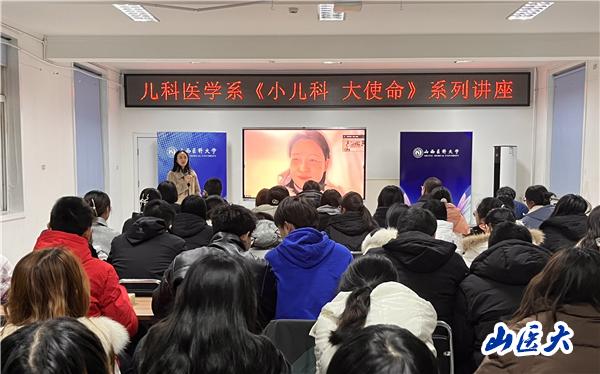1月11日下午,儿科医学系“小儿科 大使命”系列讲座之《儿科医生的成长之路》在迎泽校区采用线上线下相结合的方式举行。讲座由儿科医学系研究生党支部承办,特邀上海交通大学医学院附属瑞金医院儿内科副主任医师、医学博士吴群主讲,研究生于成皓、蒋劲嵩副讲,儿科医学系党总支副书记张晓林、硕士生导师蔚京京、思想政治辅导员阎冲、本科生党支部书记刘斌、儿科医学系部分研究生及本科生50余人参加现场活动。