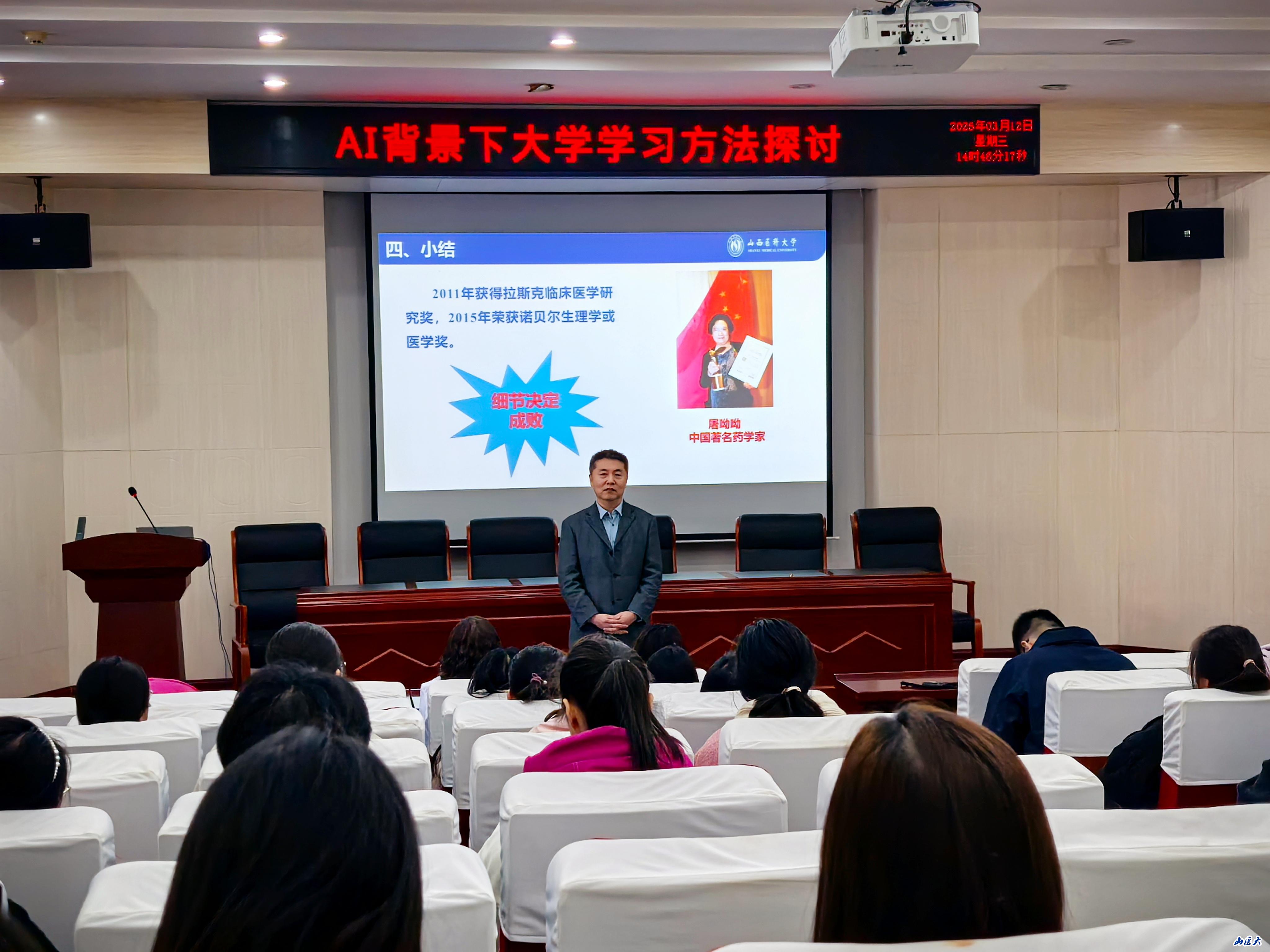 3月12日下午,我校药学院在中都校区举办了“师生同行 启航成长”导师进毓秀社区系列讲座(四)——“AI背景下大学学习方法探讨”。本次讲座由山西省教学成果一等奖、山西省高校教学名师、药学院张爱平教授主讲。学校网络中心主任马振中,药学院党委副书记童玲,毓慧A楼层长代表、药学院副院长李云兰,药学院分团委书记赵子瑞,药学院辅导员老师姜敏、王虹丹,以及百余名学生代表参加。讲座由药学院研究生党支部书记、宿舍导师代表魏贝主持。