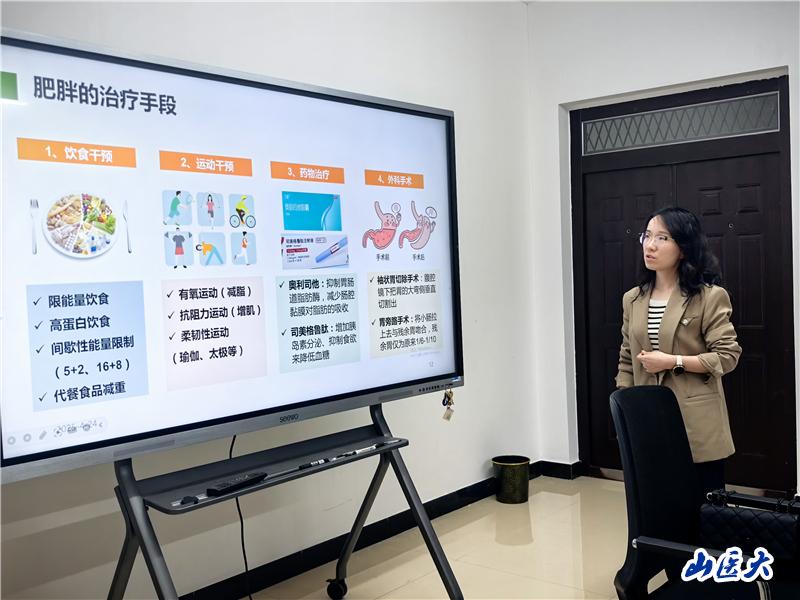 本次活动特别邀请山西白求恩医院临床营养科主任段若男围绕肥胖的危害、体重管理的意义、体重管理常见误区以及减脂期如何合理搭配饮食、青少年如何科学减重等话题,通过知识普及、典型病例分析等形式与到场师生进行了深入的互动交流。通过讲解,帮助师生了解如何依据体测数据定制个性化体重管理方案,采用合理方法,做到安全减重。